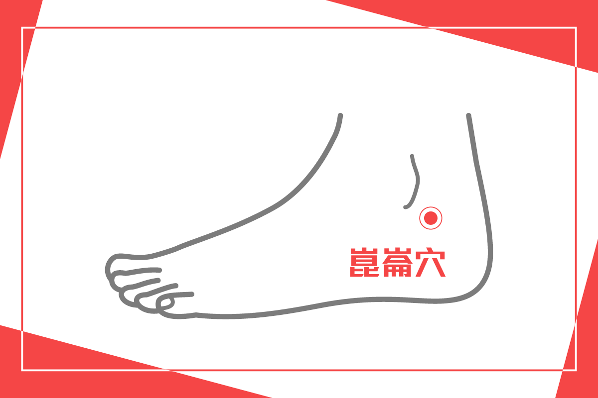 「崑崙」原指山丘,此處形容外踝高起,穴位位於其旁,故以中國著名的崑崙山命名。崑崙穴屬足太陽膀胱經,位於足部外踝後方,外踝尖與跟腱之間的凹陷處。