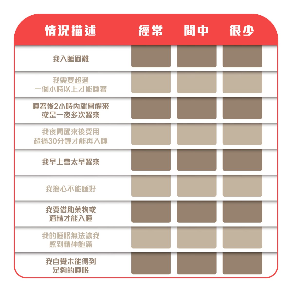 如果你符合越多項,而且大多數「經常」,那代為你患上失眠的可能性越大,需盡早求醫,向中西醫尋求失眠解決方法!