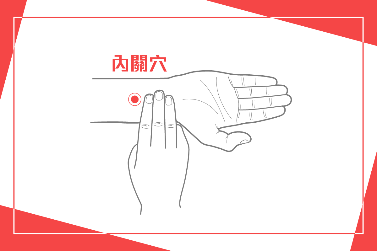 穴位位置:位於腕臂內側,掌長肌腱與橈側腕屈肌腱之間,腕橫紋上2寸處。取穴方法:將一手三指併攏,無名指放在另一手腕橫紋中央,食指下方按之凹陷並有酸痛感處即為內關穴。