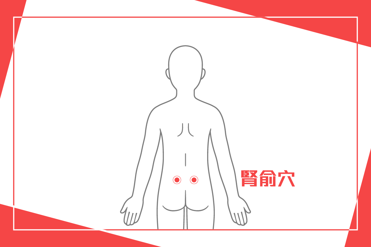 腎俞穴位於後腰,與肚臍正後方的命門穴平行,在第二腰椎棘突下,旁開約兩指寬(1.5寸)處。