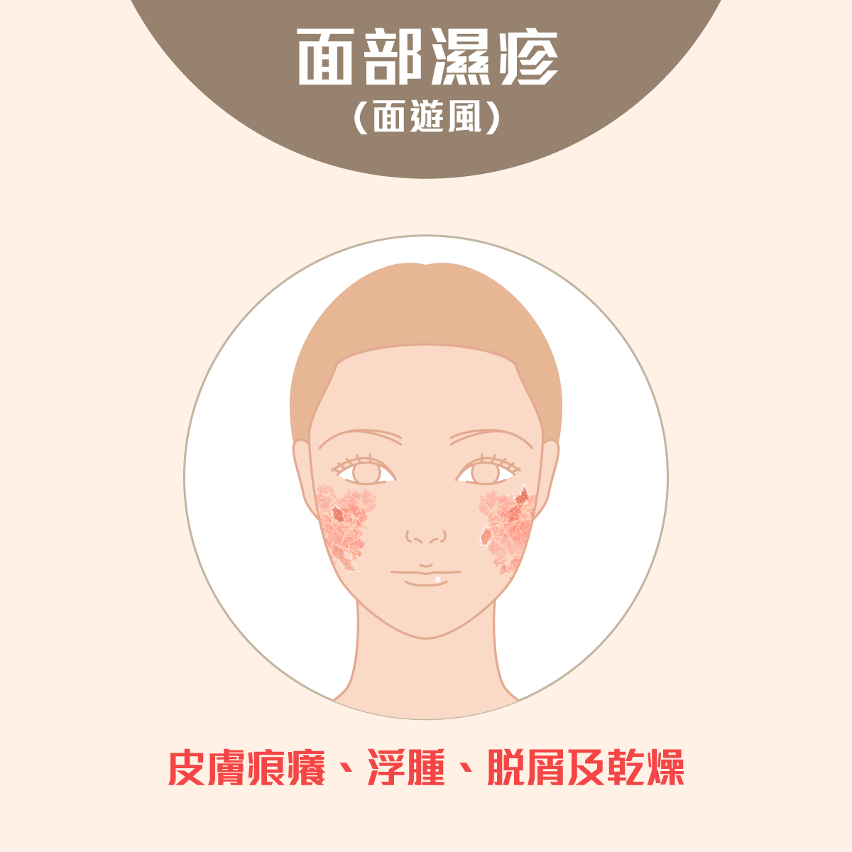 濕疹特征:常見受影響部位包括眼周、臉頰、頸後。局部表現為皮膚痕癢、浮腫、脫屑、肌膚乾燥。