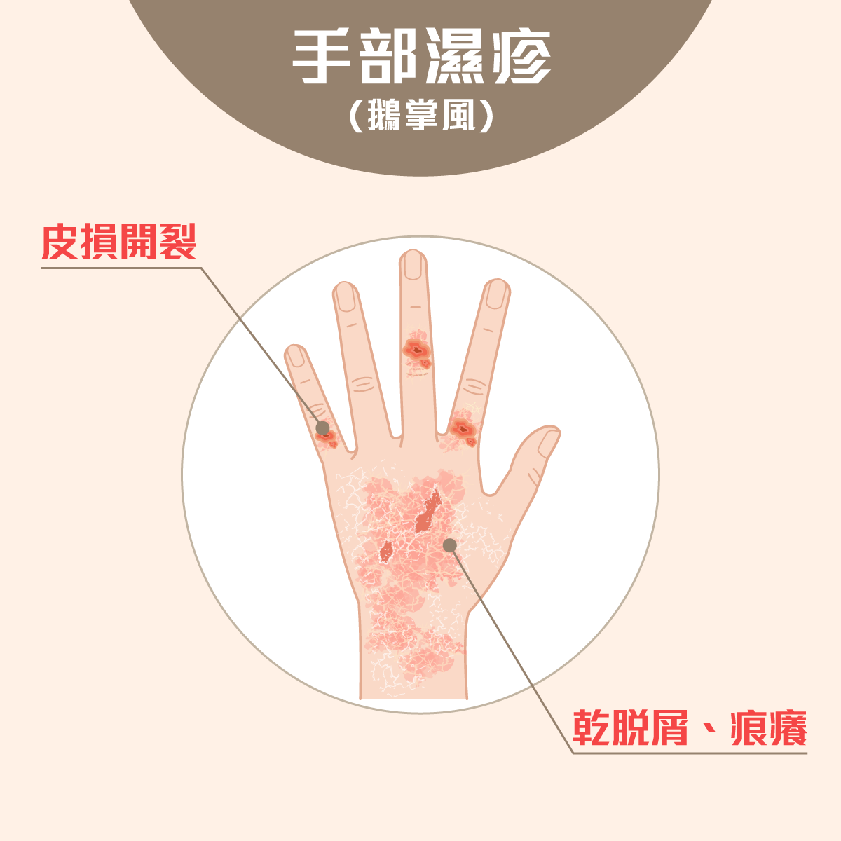 發病機理:大多與肺脾兩虛,陰虛火旺,濕熱藴結等有關,體內濕氣代謝出現問題,毛孔無法正常開闔代謝體內濕氣,引發病情。加上雙手每天都會接觸不同的物質更容易受到感染,故病情反覆發作。