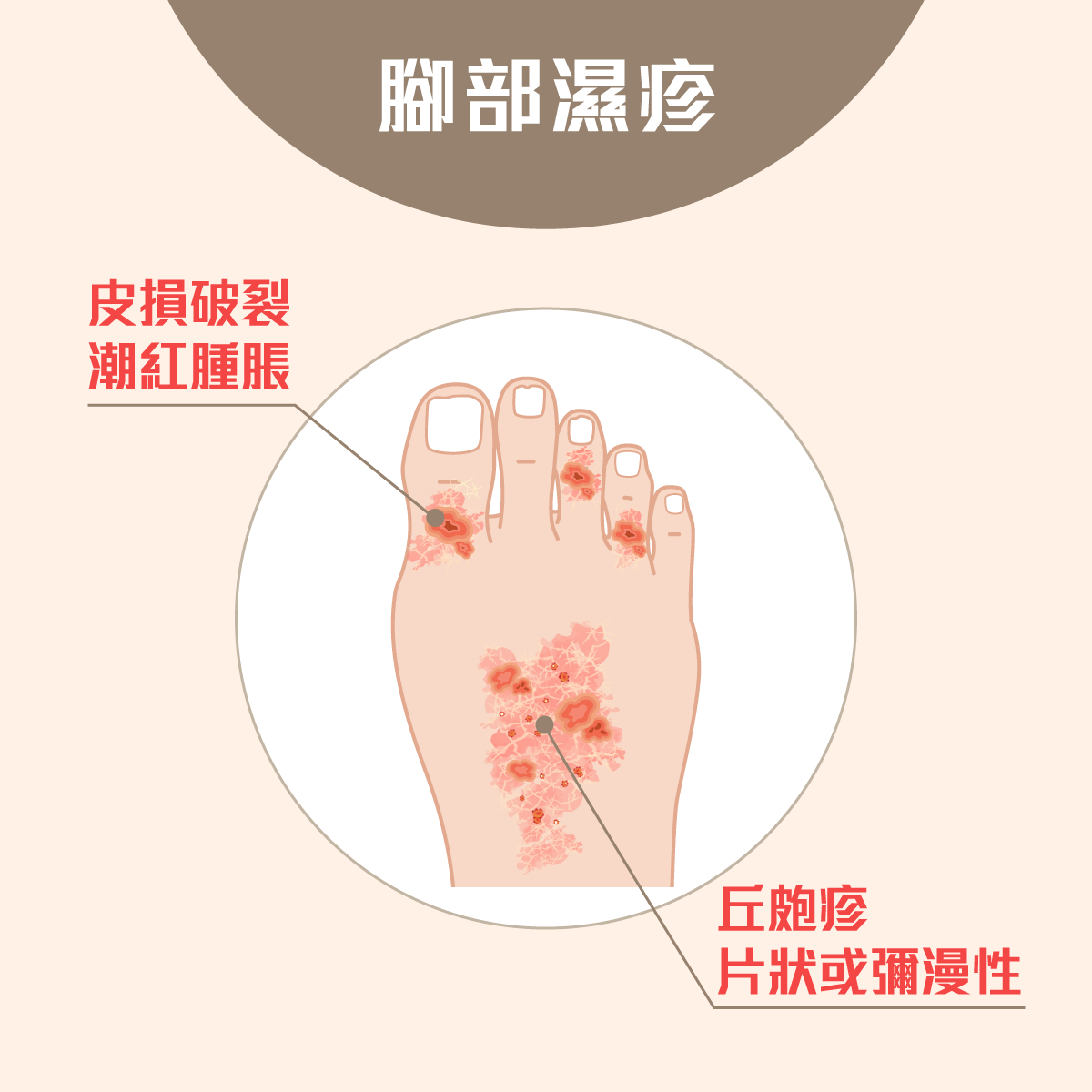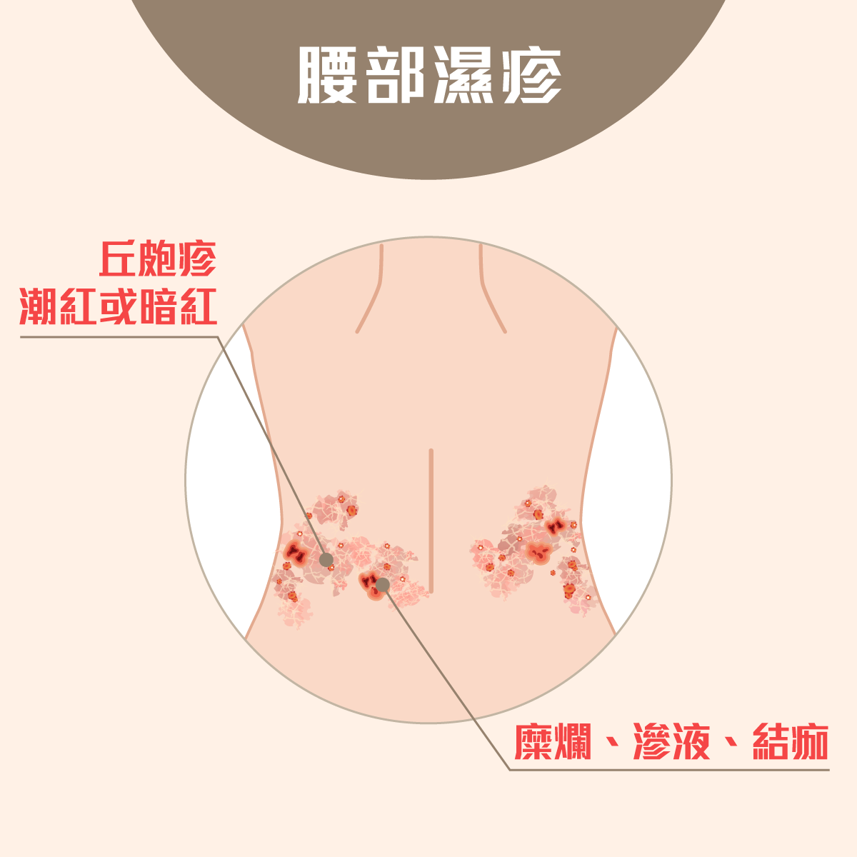 濕疹特徵:常因痕癢而使傷口破裂,逐漸出現丘疹、丘皰疹、水皰,皮損潮紅、腫脹,且患處常為片狀或彌漫性,邊界不清。