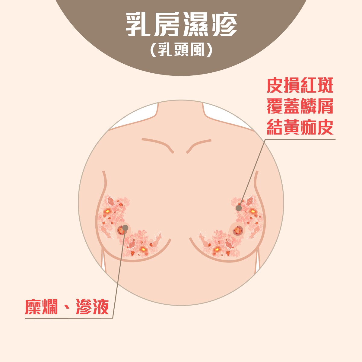 濕疹特徵:常兩側對稱發生,損害局限於乳頭或乳房,乳頭的皮損常表現為潮濕、糜爛、滲液,乳房皮損常見紅斑、丘疹或丘皰疹,或皮損覆蓋鱗屑,或結黃痂皮,若反覆發作可開裂疼痛。