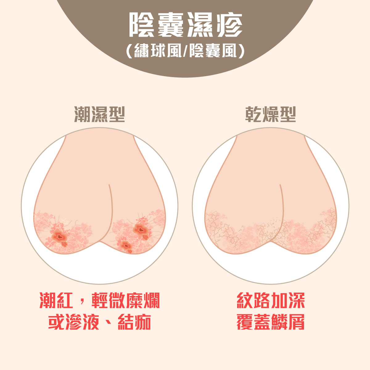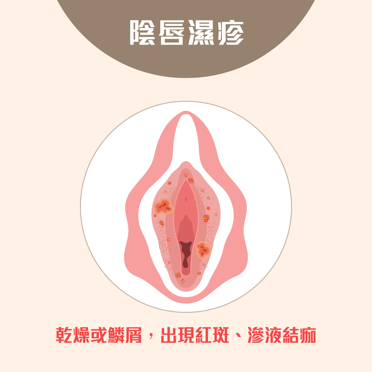 濕疹特徵:多見於大陰唇及周圍皮膚,偶可波及小陰唇或會陰。患者陰部的皮膚肥厚、紋理加深,常伴乾燥或鱗屑,奇癢難耐,搔抓後可能會出現紅斑、抓痕,甚至滲液結痂。