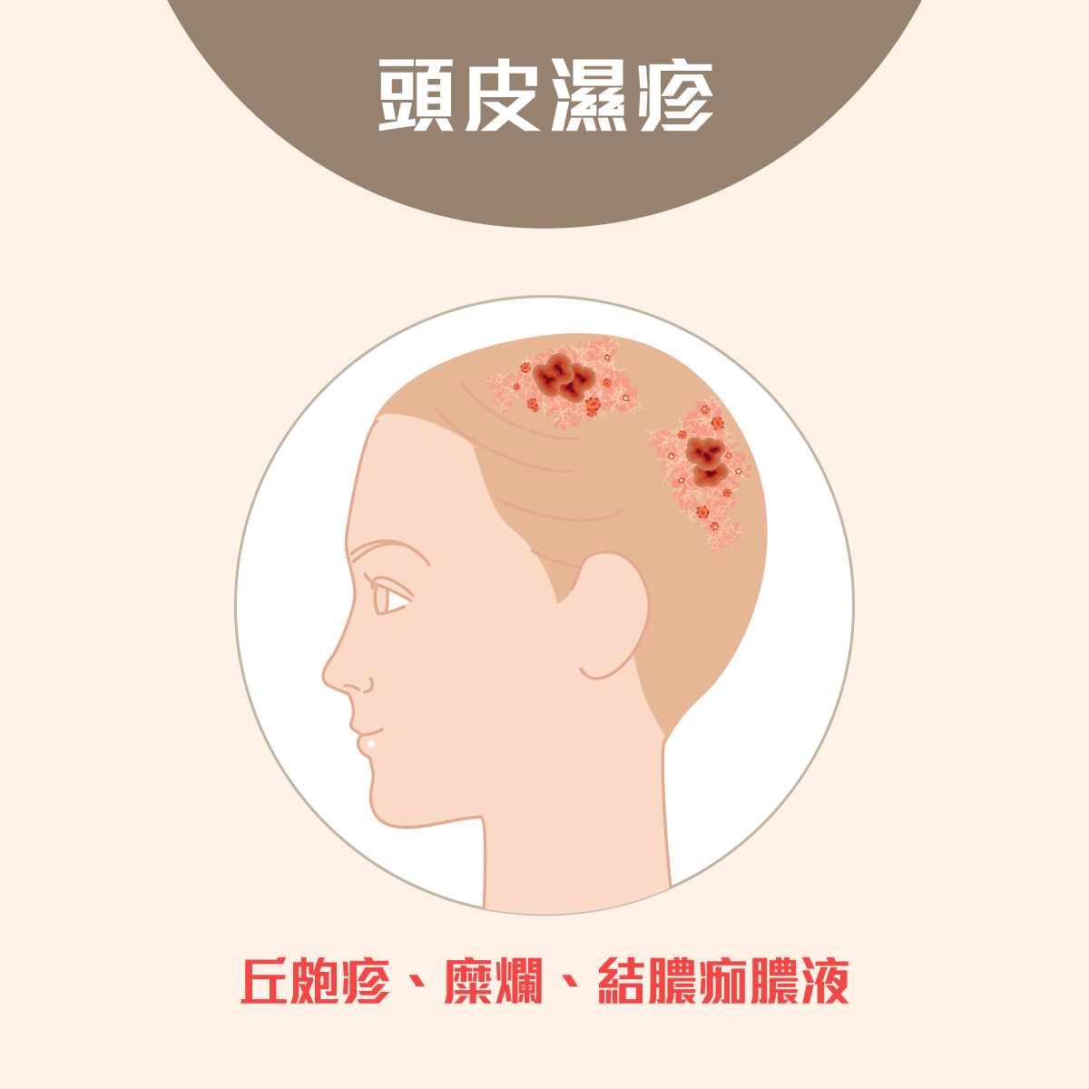 發病機理:多見肺部風熱、肝腎陰虛、陰虛火旺、脾胃消化不良,胃腸濕熱便秘等問題導致代謝產物不能由胃腸排走而濕熱熏蒸至頭部引發濕疹。由於身體內臟功能失調,外邪容易乘虛而入,所以或會因染髮及使用不當的護髮用品而誘發。
