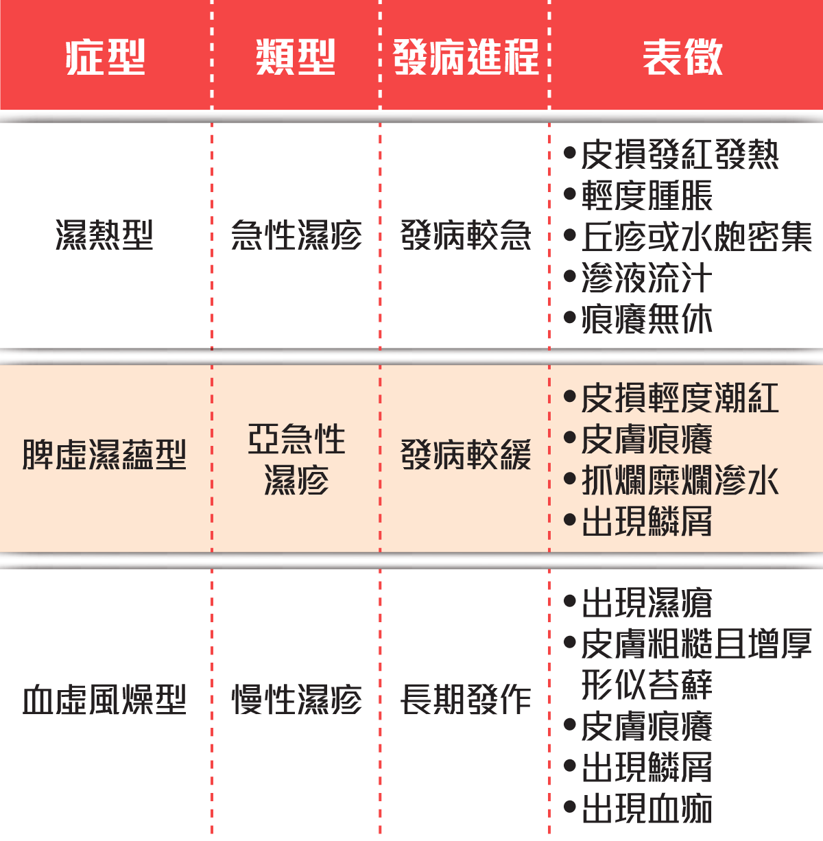 濕疹為何總是在不同的位置反覆發作?除了外在環境的影響,中醫認為關鍵在於「體質」。不同體質的人,會出現完全不同的濕疹表現、發作位置,如皮膚紅腫、痕癢難耐,或是反覆滲水、久久未癒,又或者皮膚變得粗糙厚硬,這些差異是由於濕疹患者分成不同體質,如「濕熱型」、「脾虛濕蘊型」、「血虛風燥型」,想要真正改善濕疹,應了解自己屬於哪種體質,濕疹在哪些位置發作,才能對症調理。