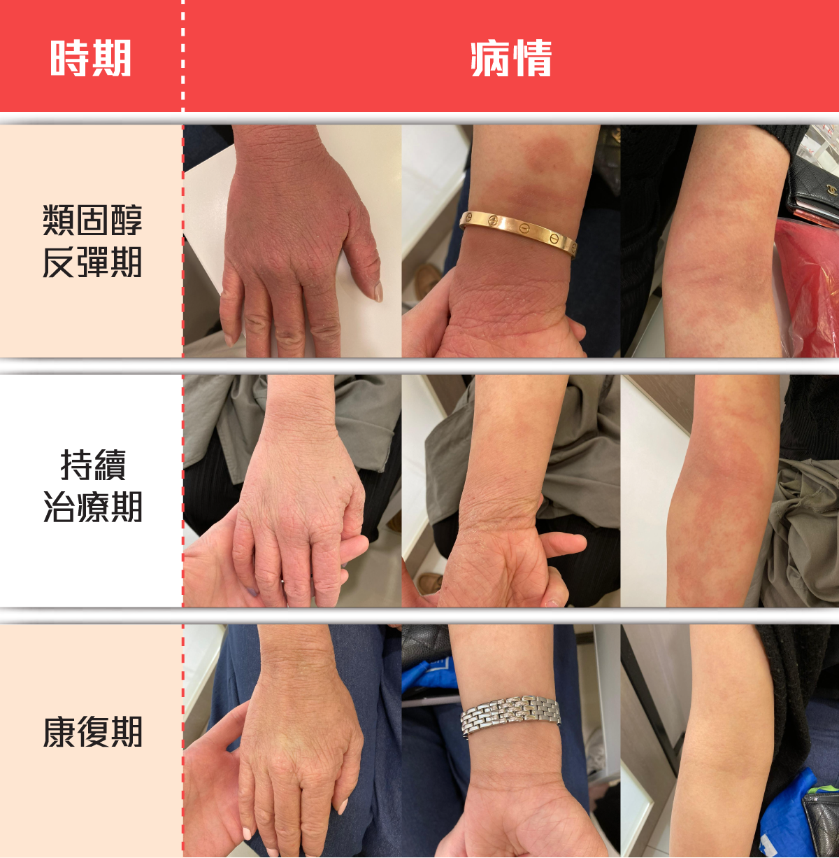 筆者為其診症後,處方內服中藥,且吩咐患者停止使用類固醇及戒口,並解釋停用類固醇會有戒斷反應。患者於一周後覆診,因類固醇戒斷反應,令手掌濕疹症狀加重,色紅,範圍持續增大,腫脹、瘙癢劇烈,甚至蔓延至手肘,頸部前緣可見色紅皮損,後處方內服中藥持續治療月餘,期間配合1次刺絡療法,手肘及頸部色紅皮損減退,手掌紅腫熱持續減退,皮損範圍縮小,剩餘暗色色素沉澱。其後經過斷斷續續2個月治療後,暗色色素沉澱改善,瘙癢大大減輕,沒有再影響睡眠,痕癢偶發。